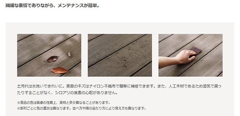 LIXILのウッドデッキはすべて樹脂の人工木材を使用しており、天然木ではありません。