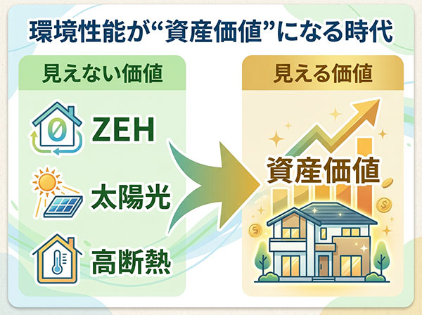 ZEH住宅(ネット・ゼロ・エネルギー・ハウス)や太陽光発電、高断熱仕様など、環境性能の高い住宅が資産価値の面でも高く評価されるようになってきました。